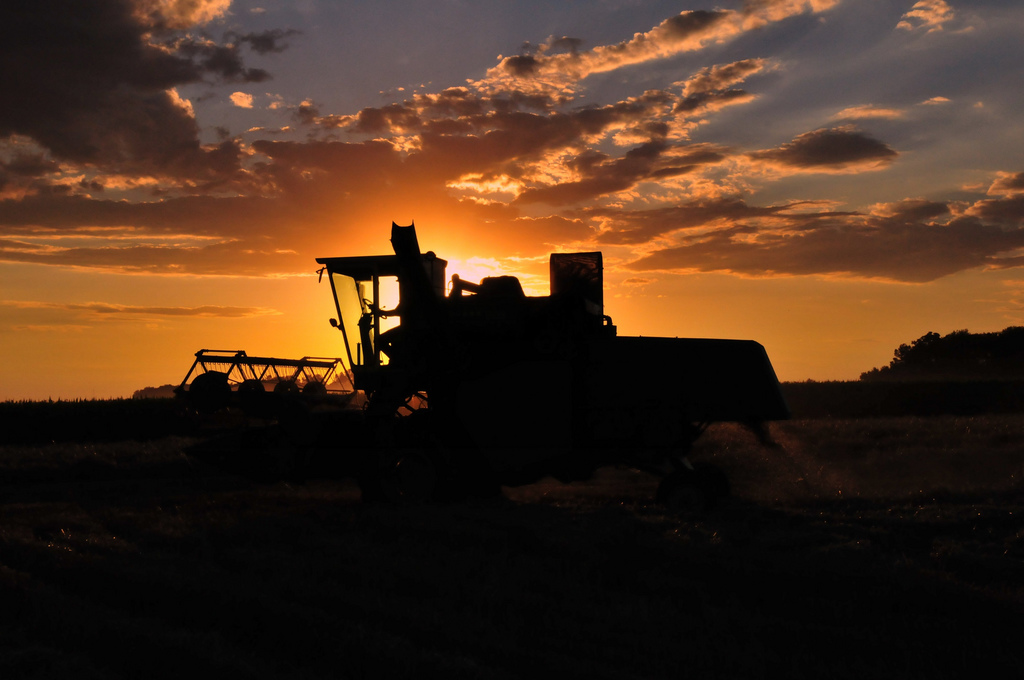 Incredible sunset with a John Deere harvester: