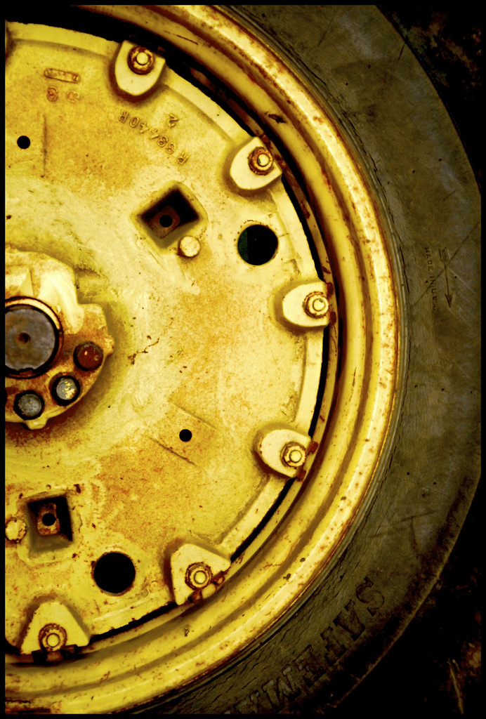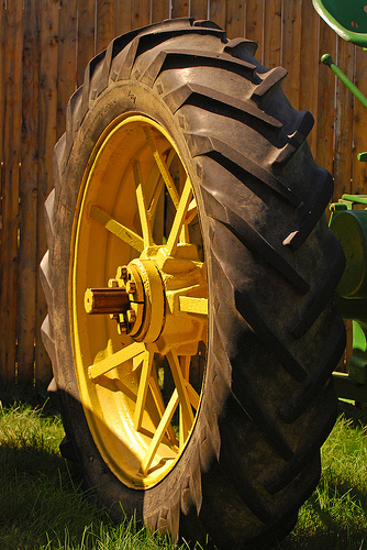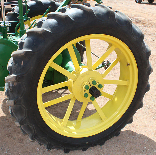 Rear tire of a 1935 John Deere Model A tractor seen at an Arizona Flywheelers tractor show in Cottonwood, Arizona: