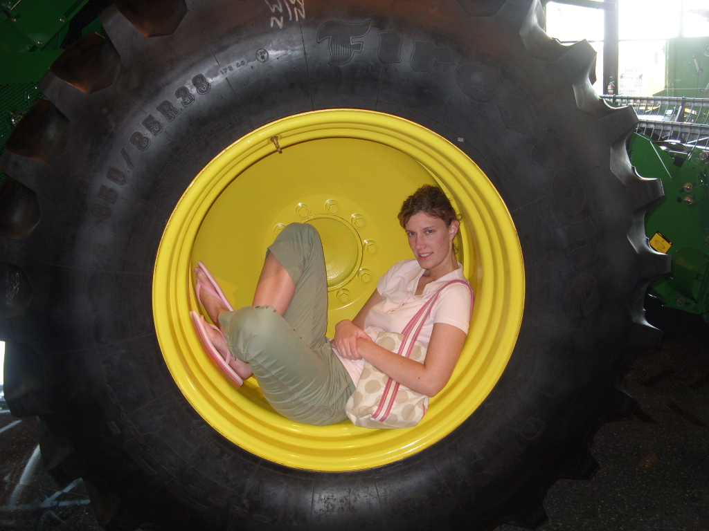 Someone had the right idea for a place to relax – inside the tire of a tractor on display in the John Deere Museum in Moline, Illinois: