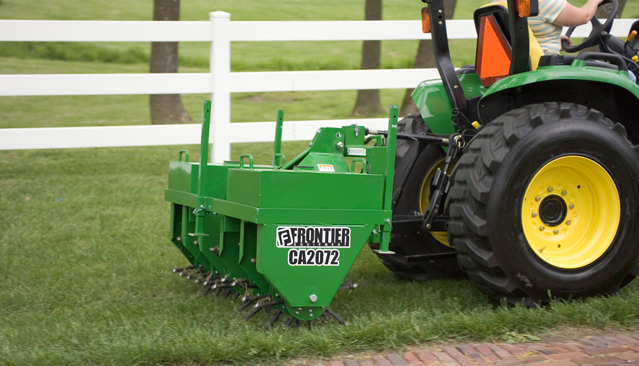 The overseeder compact tractor attachment aerates, meters, and incorporates seed while compacting the seed to ensure successful germination each and every time. The attachments slicing knives are flat and used to minimize disturbance to the existing turf.